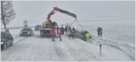 Helfer brauchten selbst Hilfe: Ein Abschleppfahrzeug blieb beim Wendemanöver hängen. Kurz unterstützten wir beim Freimachen des Fahrzeugs, sodass dieses seine Fahrt fortsetzen konnte. Anschließend rückten wir wieder ins Feuerwehrhaus ein – oder doch nicht?